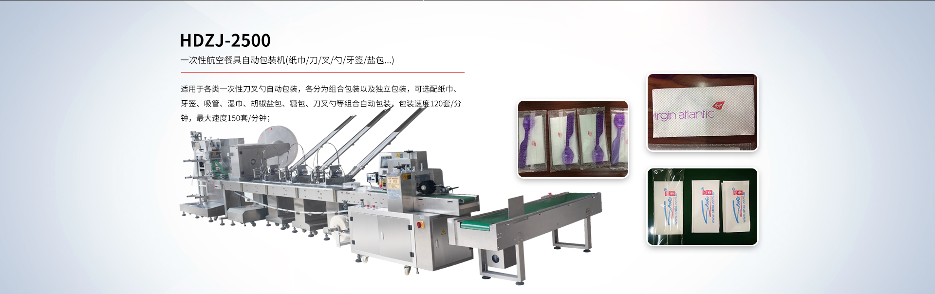 • HDZJ-2500 一次性航空餐具自動包裝機(jī)(紙巾/刀/叉/勺/牙簽/鹽包...)